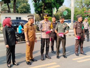 Metro — Dalam rangka menyambut Hari Kemerdekaan Republik Indonesia ke-80, Ketua DPRD Kota Metro Ria Hartini bersama Walikota Metro Bambang Iman Santoso dan Forkopimda, membagikan ratusan bendera merah putih kepada pengendara di depan Kantor Walikota Metro, Senin (11/8/2025).